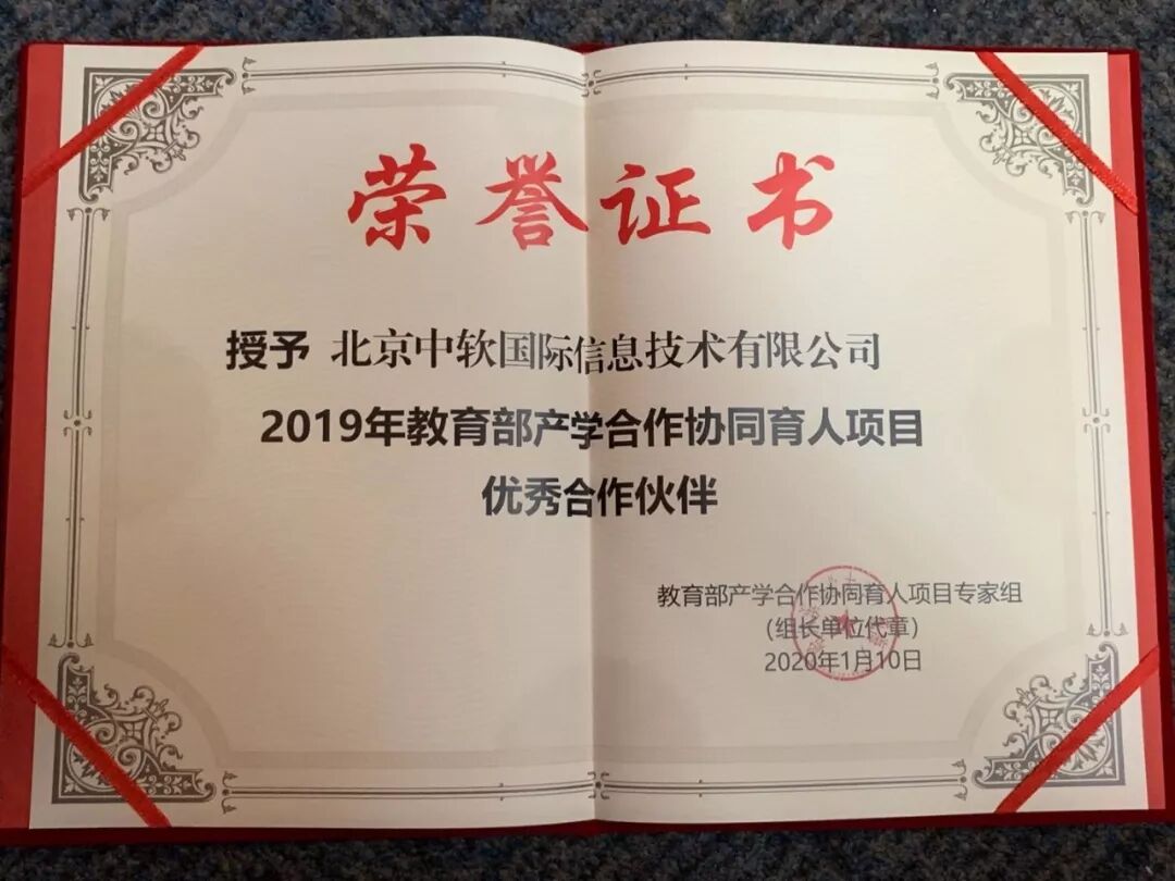 “2019年产学合作协同育人项目优秀合作伙伴”证书