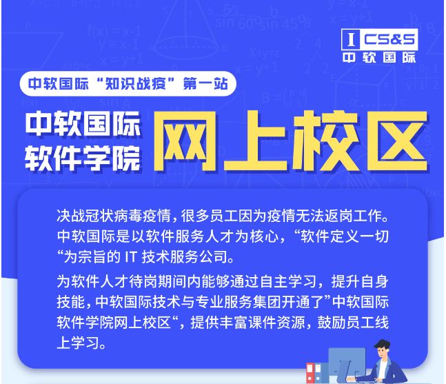 作为一家专业的软件服务企业,全球共6万多名员工,中软国际在这场抗疫行动中,不仅在健康安全方面积极抗战,对于特殊时期无法复工的同事们,更推出了一系列专业进阶计划,通过开设网校、大咖直播授课、知识竞赛、认证考试费用返还激励、“线上项目经理大会”多种形式等,吹响“知识战疫”集结号,帮助员工们充分利用待岗的空档期快速充电,完成专业技能进化,以便在未来获得更好的个人发展,为社会输出更强的IT力量。