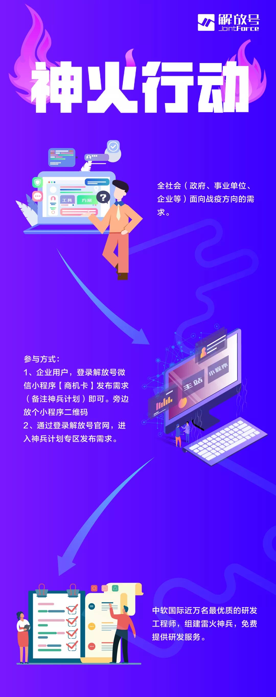政府、事业单位、社会组织及企业如有面向战“疫”场景的工具、系统需求,可通过微信小程序“商机卡”发布需求(备注神兵计划),亦可登陆解放号官网,进入神兵计划专区发布需求,万名数字神兵将以雷霆速度,响应需求,提供服务。
